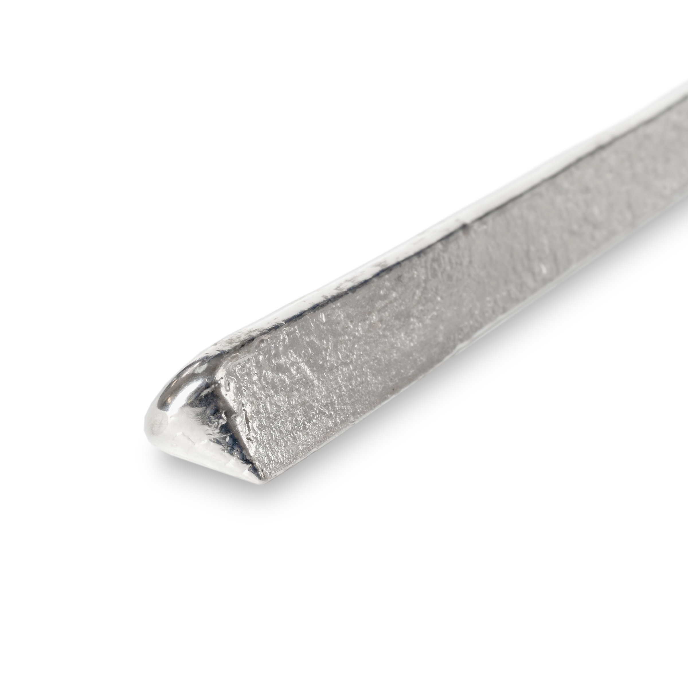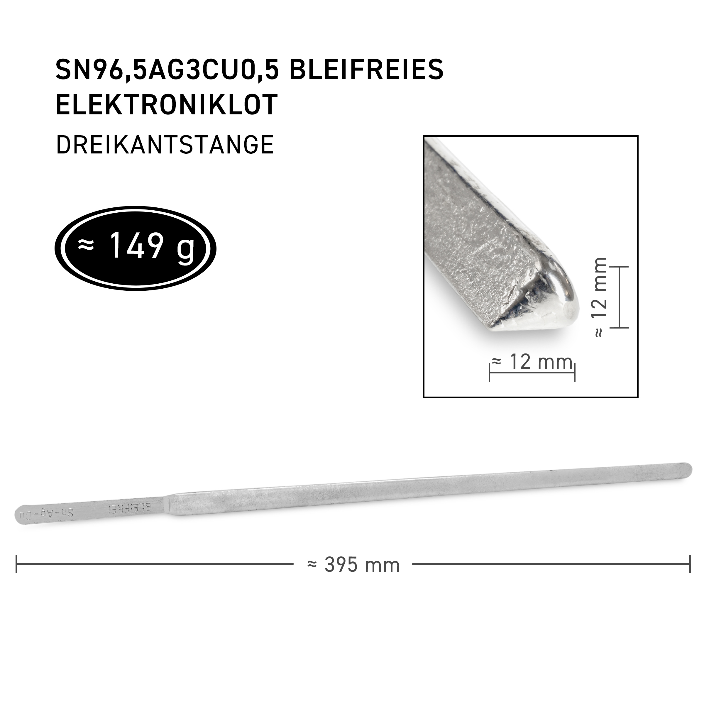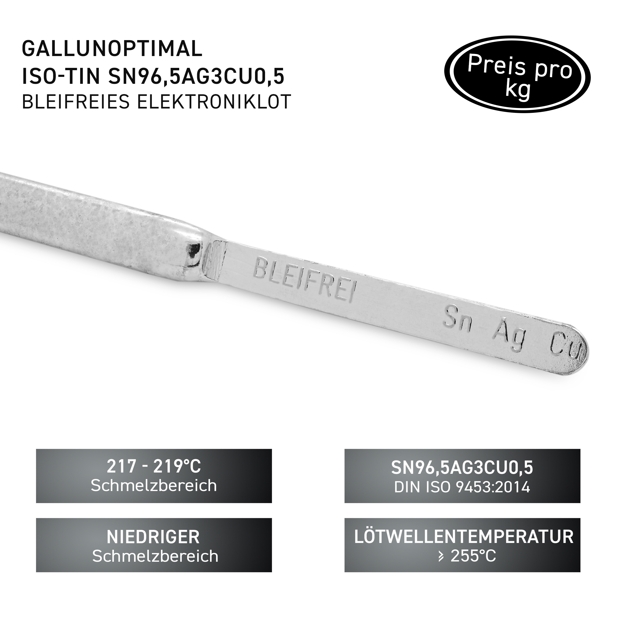 ISO-Tin Sn96.5Ag3Cu0.5 lead-free electronic solder as a 250 g triangular bar for wave, selective and dip soldering, DIN ISO 9453: 2014 Sn96,5Ag3Cu0,5, melting range 217-219°C, rec. solder wave temperature >/= 255°C, price per kg.