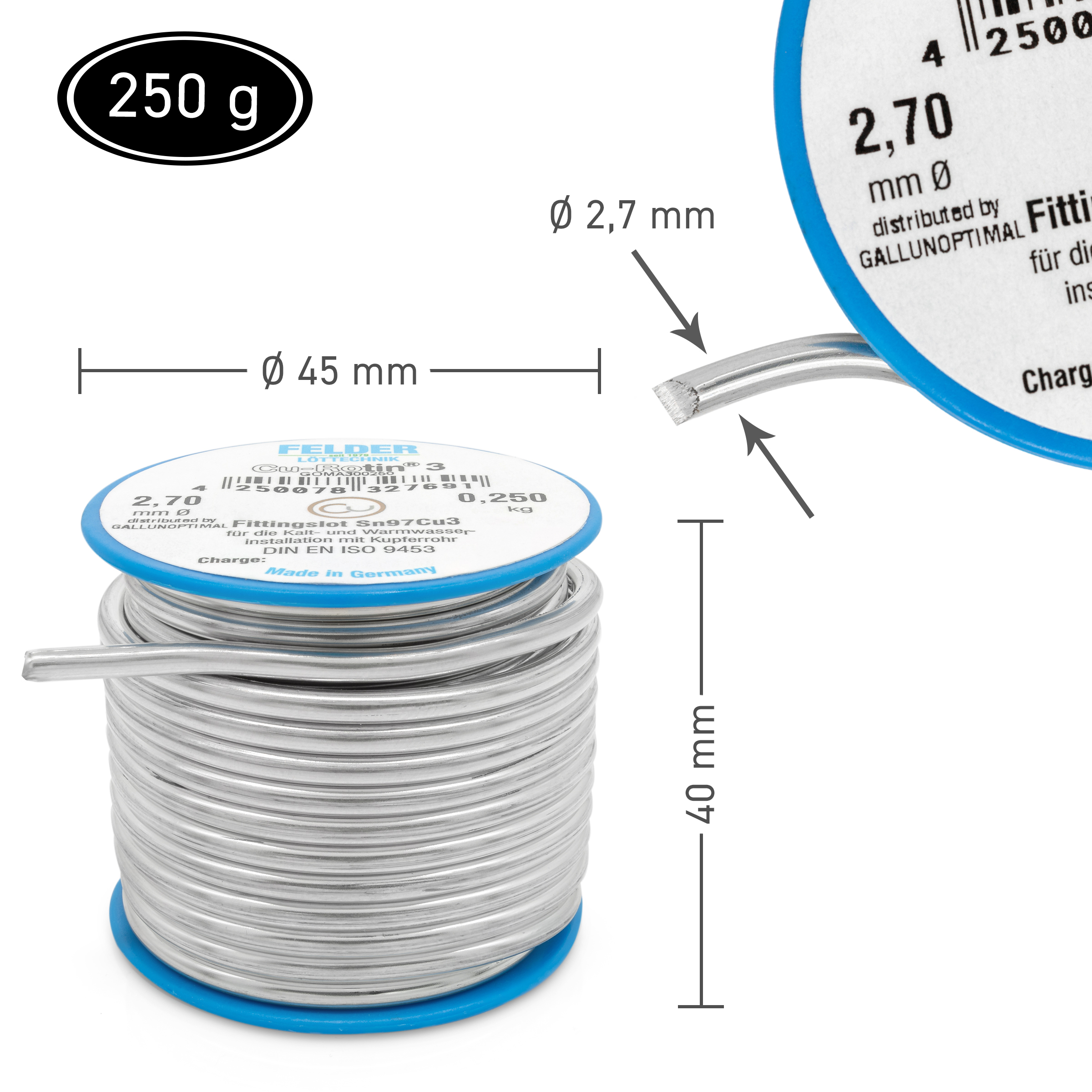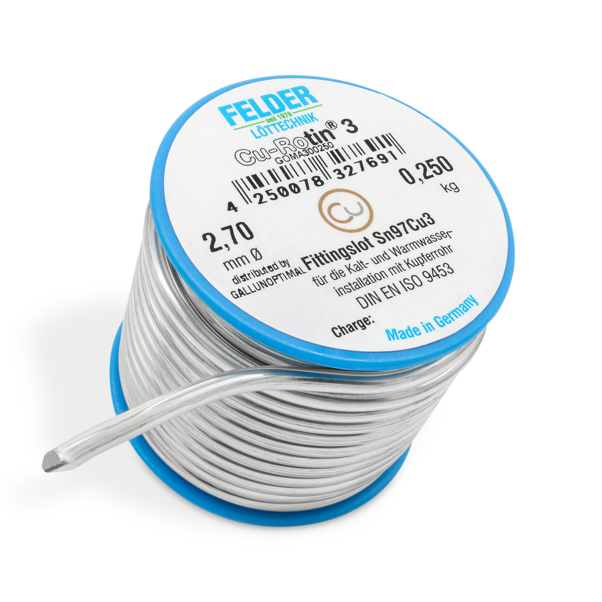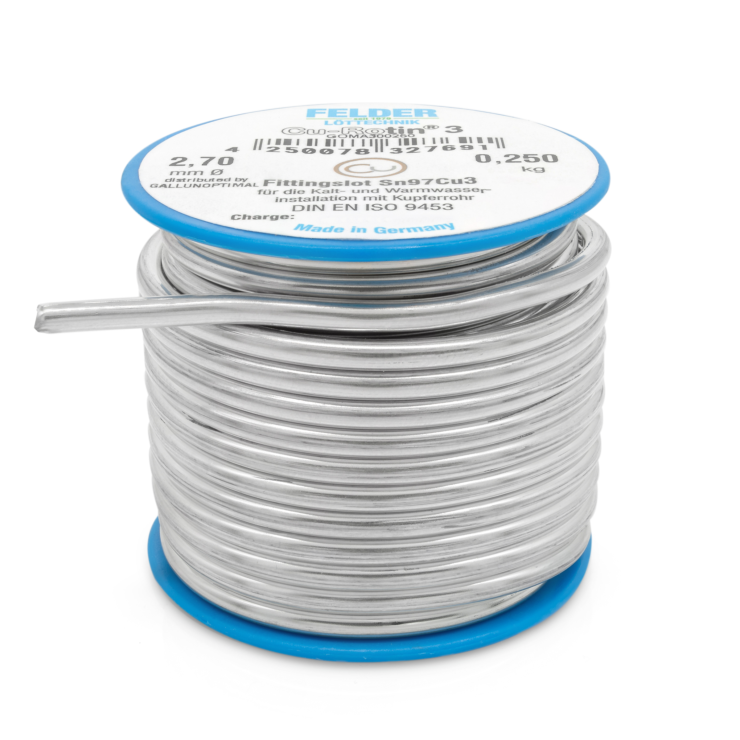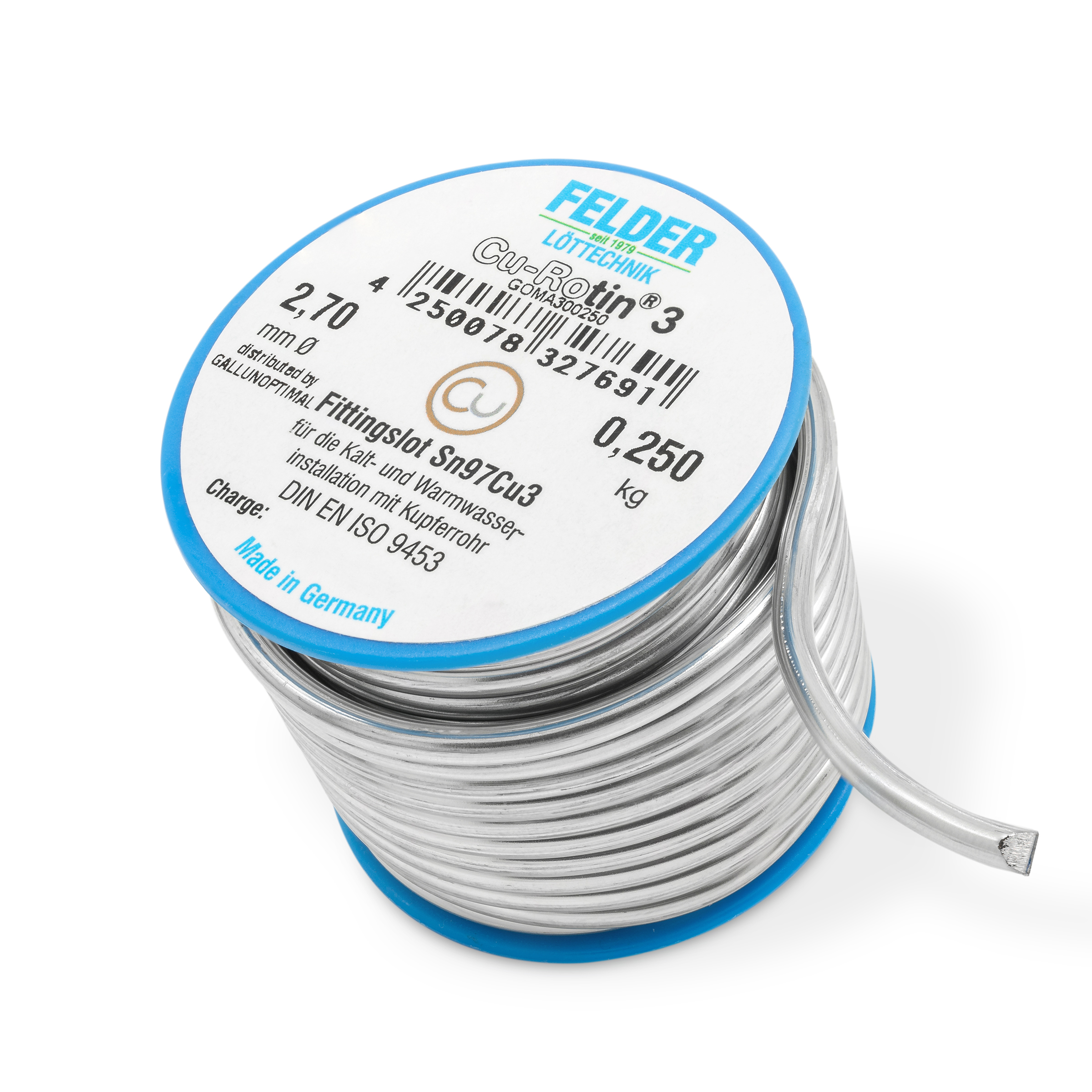 FELDER Fittingslot Cu-Rotin 3, zum Weichlöten von Kupferrohren in der Trinkwasser- und Heizungsinstallation bis 110°C, Sn97Cu3, Schmelzbereich 230-250°C, 2,7mm, 250g Spule, bevorzugt in Verbindung mit Fittingslötpaste Cu-Rofix 3-Spezial