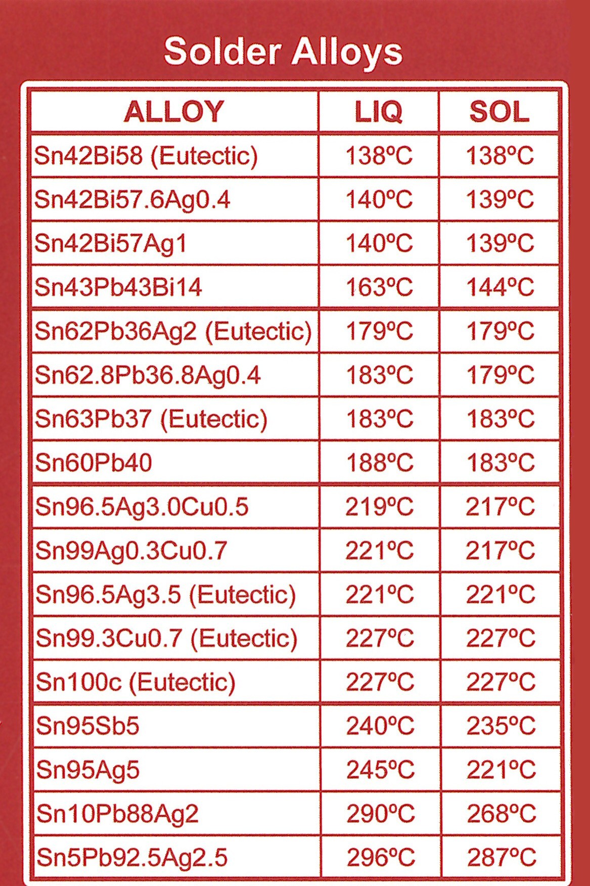 – Übersichtskarte mit Prozesstemperaturen für die beliebtesten Lötzinnlegierungen
