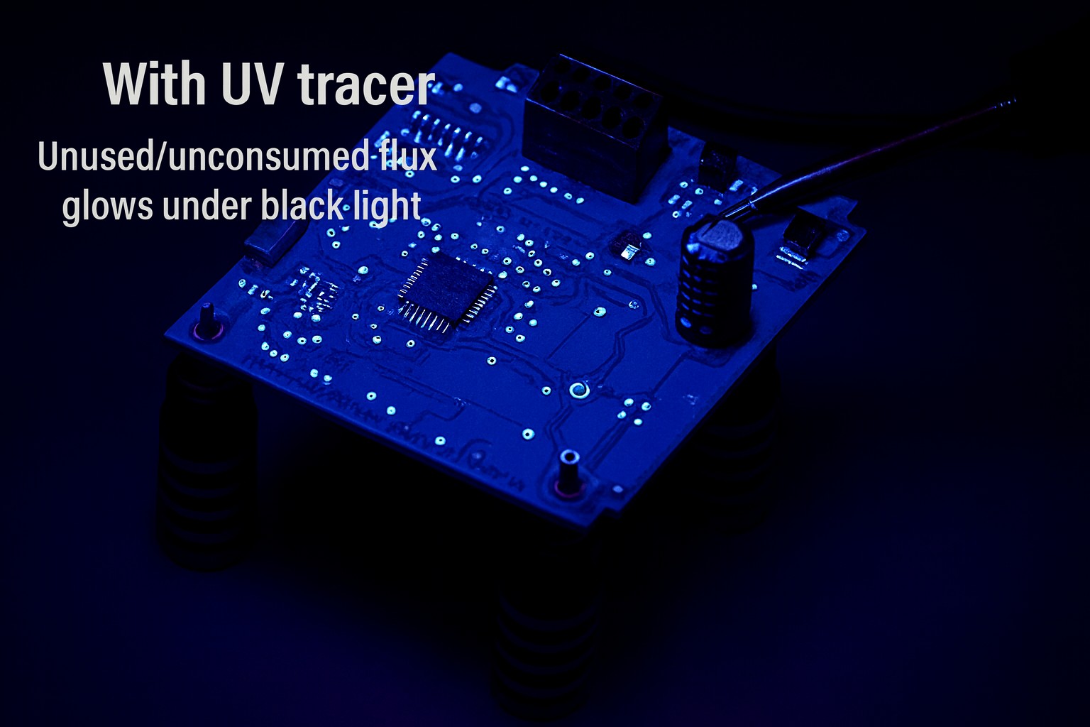 Nach der Reinigung der Platine macht der integrierete UV-Tracer verbliebene Flussmittelreste unter UV-Licht sichtbar.